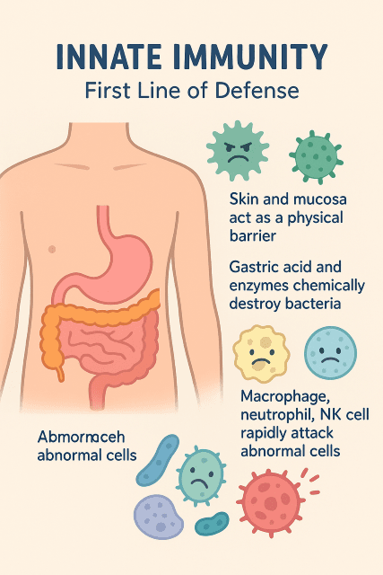 우리 몸의 면역 체계는 크게 선천면역후천면역으로 구분됩니다. 먼저 선천면역(innate immunity)은 태어날 때부터 주어진 기본 방어 체계입니다.