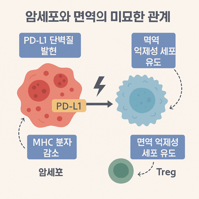 흥미로운 점은 우리 몸에서는 매일같이 돌연변이 세포가 생겨나지만, 대부분 면역 감시(immunosurveillance) 덕분에 제거된다는 사실입니다. 그러나 일부 암세포는 매우 영리한 전략을 사용합니다.