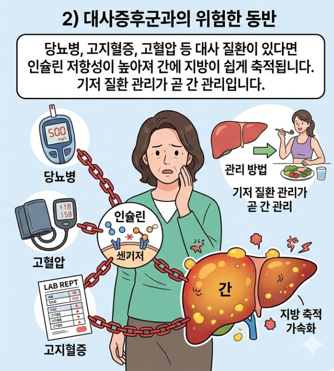 당뇨병, 고지혈증, 고혈압 등 대사 질환이 있다면 인슐린 저항성이 높아져 간에 지방이 쉽게 축적됩니다. 기저 질환 관리가 곧 간 관리입니다.