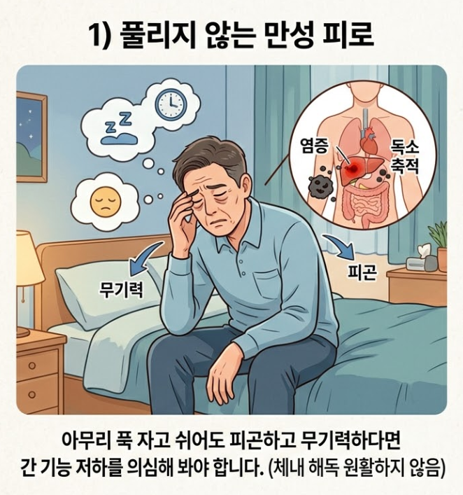 아무리 푹 자고 쉬어도 피곤하고 무기력하다면 간 기능 저하를 의심해 봐야 합니다. 간에 염증이 생기면 체내 해독이 원활하지 않아 독소가 쌓이기 때문입니다.