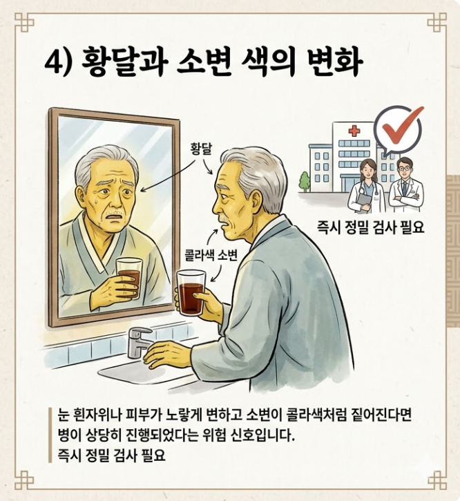 눈 흰자위나 피부가 노랗게 변하고 소변이 콜라색처럼 짙어진다면 병이 상당히 진행되었다는 위험 신호입니다. 즉시 정밀 검사가 필요합니다.