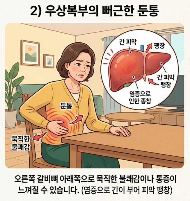 오른쪽 갈비뼈 아래쪽으로 묵직한 불쾌감이나 통증이 느껴질 수 있습니다. 염증으로 인해 간이 부어오르면서 간을 둘러싼 피막을 팽창시켜 나타나는 현상입니다.