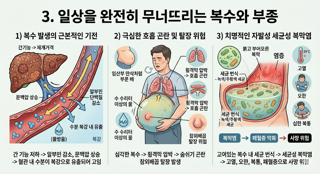 간 기능 저하로 혈관 내 수분을 붙잡아두는 알부민 단백질 합성이 줄어들고, 문맥압이 상승하면서 혈관 안의 수분이 복강(배 안)으로 속절없이 빠져나와 고이는 현상입니다.