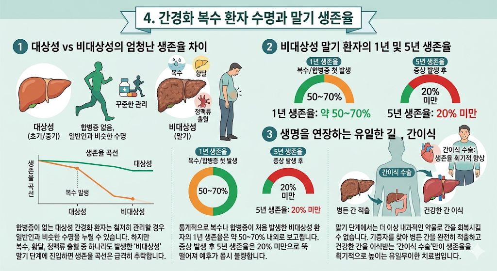 합병증이 없는 대상성 간경화 환자는 철저히 관리할 경우 일반인과 비슷한 수명을 누릴 수 있습니다. 하지만 복수, 황달, 정맥류 출혈 중 하나라도 발생한 '비대상성' 말기 단계에 진입하면 생존율 곡선은 급격히 추락합니다.