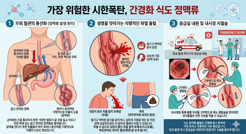 식도 정맥류 출혈은 간경화 말기 환자의 가장 흔하고 치명적인 사망 원인입니다. 증상 발생 즉시 119를 통해 응급실로 내원하여, 내시경을 통해 출혈 부위를 고무밴드로 묶는 결찰술을 받아야만 과다출혈로 인한 사망을 막을 수 있습니다.