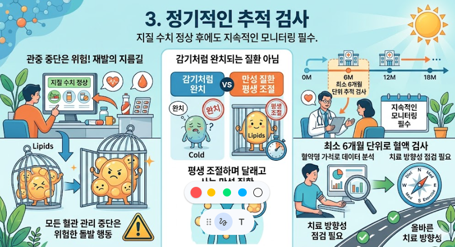 지질 수치가 정상으로 돌아왔다고 해서 안심하고 모든 혈관 관리를 중단해 버리는 것은 매우 위험한 돌발 행동입니다. 이 질환은 감기처럼 완치되는 것이 아니라 평생 조절하며 달래고 살아가는 만성 질환이므로 지속적인 모니터링이 필수입니다. 최소 6개월 단위로 혈액 검사를 받아 치료 방향성이 올바른지 꾸준히 점검해야 합니다.