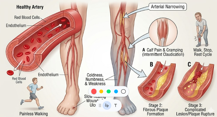 다리로 향하는 동맥이 좁아지면 일정 거리를 걸을 때 종아리나 허벅지에 터질 듯한 통증이나 경련이 발생하여 멈춰 서야 합니다. 이를 간헐적 파행증이라고 부르며 휴식을 취하면 통증이 완화되지만 다시 걸으면 증상이 반복되어 일상적인 보행에 큰 지장을 줍니다. 병이 진행되면 가만히 쉬고 있을 때도 발끝이 차갑고 통증이 느껴지며 발에 상처가 나면 쉽게 낫지 않고 궤양으로 이어질 수 있습니다.