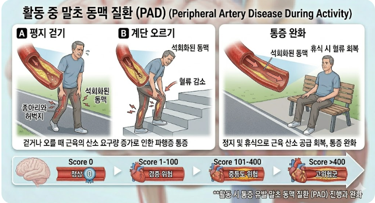 평지를 걷거나 계단을 오를 때 종아리나 허벅지에 터질 듯한 통증이 생겼다 쉬면 낫는 파행증은 말초혈관질환의 주요 증상입니다. 이는 다리 쪽 혈관의 경화가 꽤 많이 진행되었음을 시사하는 중요한 단서이므로 평소 통증의 빈도와 걷는 거리를 꼭 기록해 두어야 합니다. 잠시 휴식을 취한 후 통증이 사라진다고 해서 안심하고 방치하면 심각한 혈관 괴사로 이어질 수 있으니 즉시 병원 진료를 받아야 합니다.